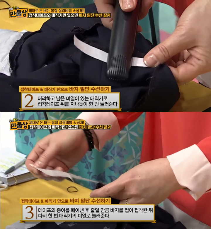 지난 2015년에 TV조선에서 방송된 살림 9단의 만물상에서는 2가지 준비물만으로 누구나 쉽게 바지 밑단을 수선할 수 있는 방법을 소개해줬습니다. 직장인들의 양복바지나 자녀들의 교복 바지 등 밑단이 있다면 어느 바지라도 수선이 가능하다고 합니다.