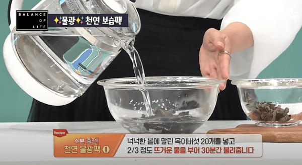 1. 말린 목이버섯 20개를 뜨거운 물에 넣고 30분간 불려주세요.