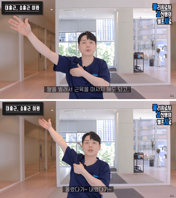 팔을 벌린 상태에서 가슴 근육을 꾹꾹 눌러서 마사지를 해주면 됩니다. 가슴 근육을 꽉 잡은 상태에서 반대쪽 팔을 올렸다가 내리는 동작을 반복해도 됩니다.