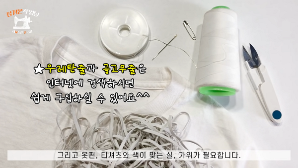 버리기엔 아까운 목 늘어난 티셔츠와 우레탄줄이 필요합니다. 다이소나 인터넷에서 저렴한 가격에 구입할 수 있습니다. 우레탄 줄이 들어갈 수 있는 구멍이 큰 바늘이 필요합니다. 어린아이도 따라 할 수 있을 정도의 아주 쉬운 초급 난이도입니다.