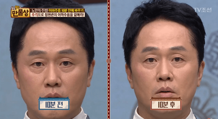이날 방송에서는 실제로 실험 참가자가 주걱으로 이마를 마사지하기 전과 후를 비교한 모습을 보여주었습니다. 단 10분 만에 이마의 주름이 놀라울 정도록 개선되는 것을 확인할 수 있었습니다.