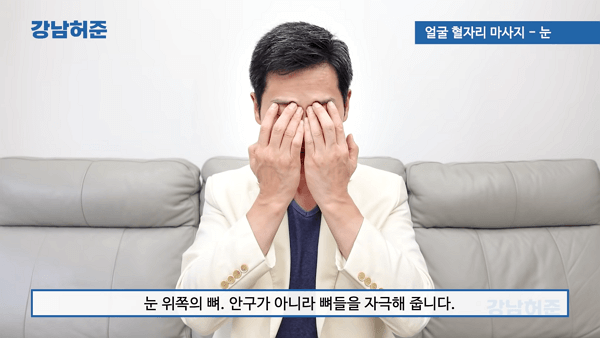 손가락 끝부분을 사용해서 눈 위쪽의 뼈를 자극해 주세요. 이때 안구가 아니라 뼈 부분에 자극을 주는 것이 중요합니다.