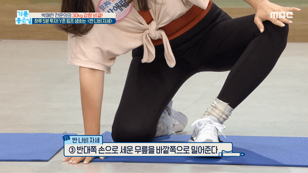 - 반대쪽 손으로 세운 무릎을 바깥 방향으로 밀어줍니다.