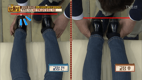 과거 TV조선에서 방송된 살림 9단의 만물상에서는 신경외과 전문의가 출연해서 짝짝이 다리를 10분 만에 교정할 수 있는 셀프 교정법을 알려줬습니다. 실제 출연했던 사람에게 실시한 결과 틀어졌던 골반이 제자리로 돌아왔으며 다리 길이도 맞춰진 것을 확인할 수 있었습니다.