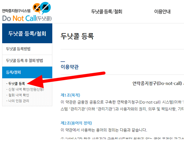 처음 두낫콜 사이트에 접속하게 되면 메뉴에 두낫콜 등록/철회가 있습니다. 이곳으로 들어간 후에 등록/철회 버튼을 누르고 두낫콜 등록 버튼을 누르세요. 개인정보 수진에 대한 내용을 동의하고 화면 아래에 있는 휴대전화 인증 버튼을 누릅니다.