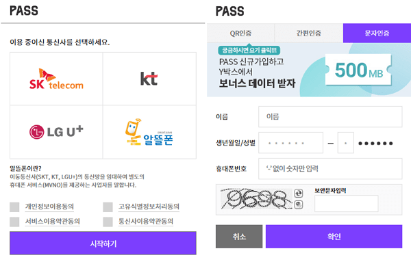 이용 중인 통신사를 선택하고 PASS 혹은 문자를 통해서 본인 인증 과정을 완료하시기 바랍니다.