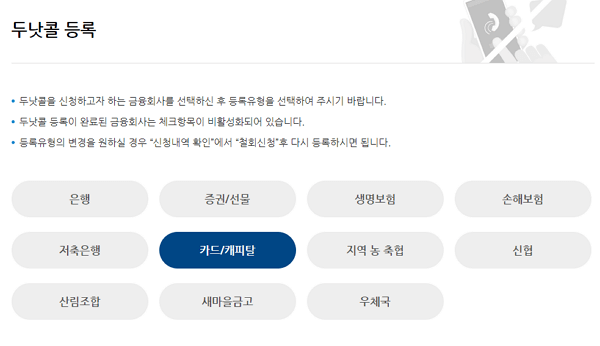 두낫콜을 신청하고자 하는 금융회사를 선택하세요. 은행, 증권/선물, 생명보험, 손해보험, 카드/캐피탈 등 다양하게 있습니다. 두낫콜 등록이 완료된 곳은 체크 항목이 비활성화되어 있습니다.