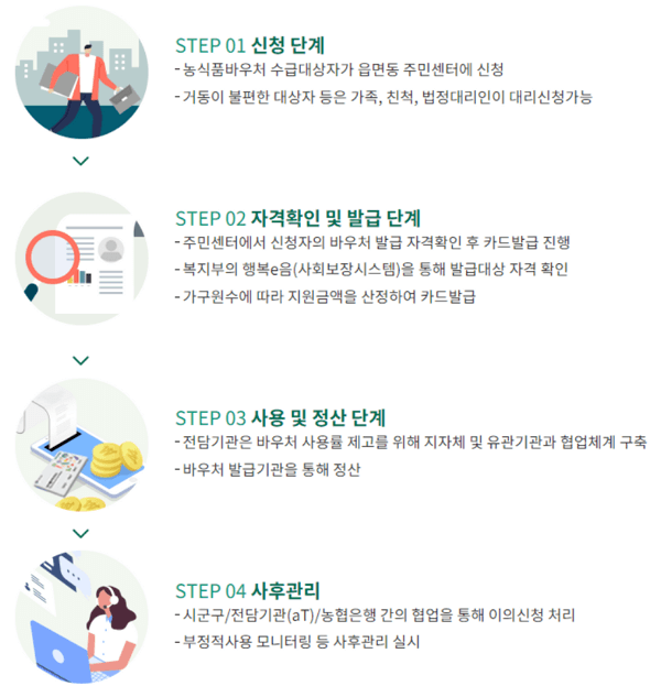 - 농식품바우처 수급대상자가 읍면동 주민센터에 신청