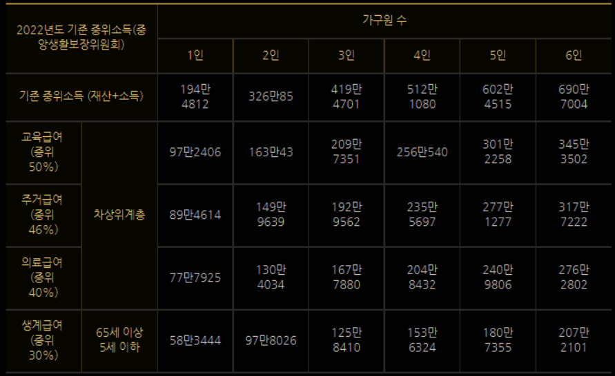 - 중위소득은 전체 가구 소득 순위에서 중간에 해당하는 기구소득을 말합니다.