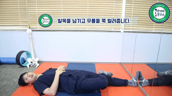 바닥에 천장을 바라보고 바르게 누워주세요. 다리를 모두 편 상태에서 한쪽 다리를 들어서 반대쪽 다리 위에 올려놓습니다. 이때, 올린 다리의 무릎을 바깥쪽으로 쭉 벌려 주세요. 힘으로 누르는 것이 아니라 툭 떨어뜨리면 됩니다.