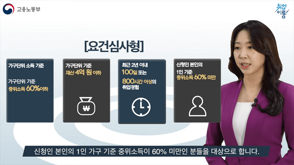 I 유형에 해당되며 15~69세 구직자 중 가구 단위 중위소득 60% 이하이며 재산이 4억 원 이하여야 합니다.