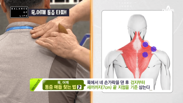 통증 매듭이 생겼을 때 억지로 스트레칭 하거나 운동을 하면 더 악화시킬 수 있습니다. 통증 매듭은 눌러줘야 풀립니다. 채널A에서 방송된 나는 몸신이다에서는 30년 경력의 재활 운동 전문가가 출연해서 목과 어깨 통증 잡는 5분 마사지를 소개해줬습니다.