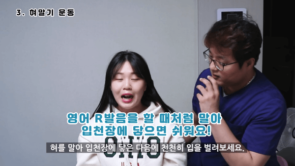 - 영어 R발음을 할 때처럼 혀를 말아서 입천장에 닿게 만드세요.