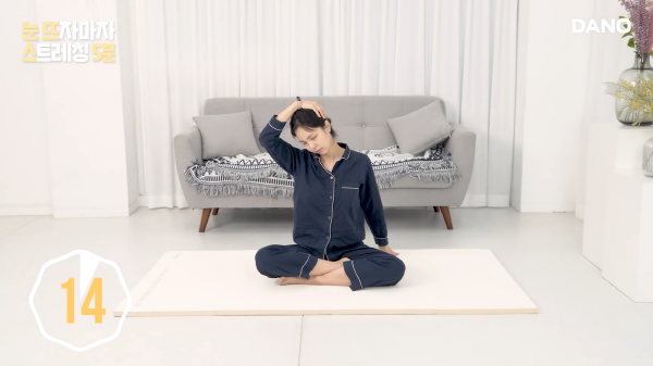 이제 자리에 앉아보도록 하겠습니다. 왼손으로 오른쪽 고개를 잡은 상태에서 대각선으로 천천히 숙여 주세요. 오른손은 뒤로 쭉 뻗어서 바닥을 짚어 주세요. 오른쪽 목선과 어깨가 천천히 멀어진다는 느낌으로 해주세요.