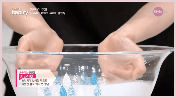 4. 이제 헹궈줘야 합니다. 마치 모공을 한 개씩 닦아준다는 생각으로 꼼꼼하게 닦아내야 합니다. 오일기가 없어질 정도로 따뜻한 물로 여러 번 헹궈 주세요. 영상 속 주인공은 30분 걸린다고 합니다.