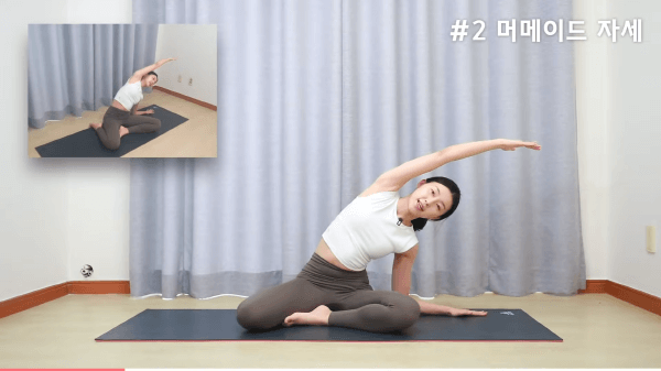 다리의 방향을 바꾼 후에 반대쪽 손을 넘겨서 옆구리 스트레칭을 합니다.