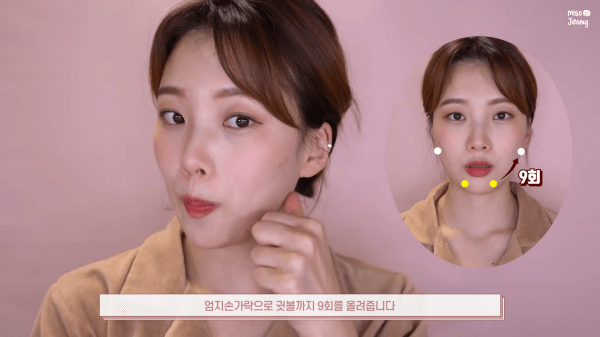 1. 입꼬리를 기준으로 아래 턱선의 0.5cm 위에 엄지 손가락을 대고 귓볼 바로 아래 위치까지 9번을 쓸어 올려 주세요. 턱선 왼쪽, 오른쪽을 모두 해주세요.