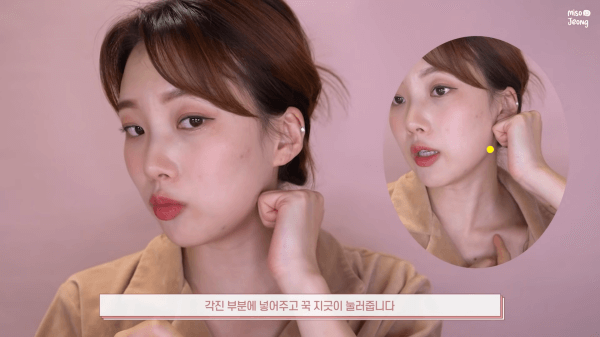 4. 주먹을 쥐고 중지와 약지의 마디 사이를 턱의 각진 부분에 대고 3~5초 정도 지긋이 눌러 줍니다.