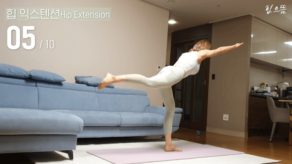 T 홀드 자세에서 양손을 머리 위로 쭉 뻗어 주세요. 다음으로 뒤에 들고 있는 다리를 밑으로 내렸다가 올리는 동작을 반복합니다. 10개 실시하면 됩니다.