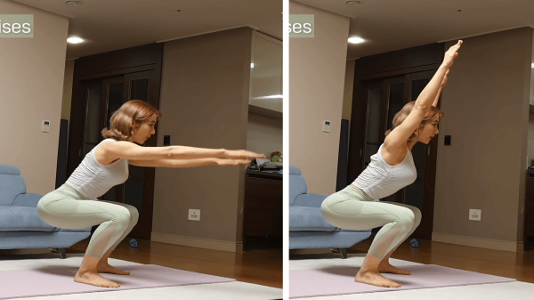 바르게 선 자세에서 팔을 앞으로 쭉 뻗으면서 스쿼트 자세로 앉아 주세요. 앉은 상태에서 팔을 머리 위로 쭉 펴면서 만세 상태로 했다가 다시 앞으로 쭉 뻗습니다. 다시 원래대로 일어섭니다. 10회 반복해서 실시합니다.