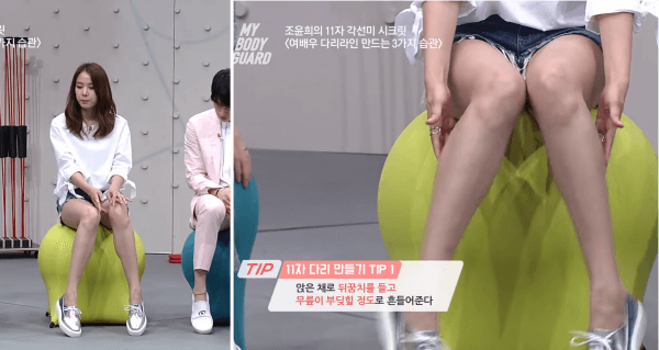 여배우 조윤희는 다리 각선미로 유명합니다. 그녀는 평소 시간이 날 때마다 11자 다리를 만들기 위해서 꾸준히 실천하고 있는 습관이 있다고 합니다.