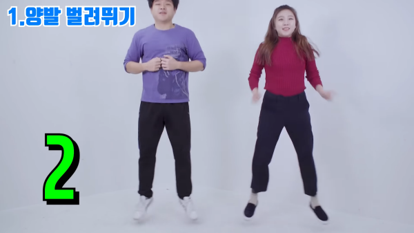 바르게 선 자세에서 점프를 뛰면서 양팔을 벌렸다가 다시 원래의 자세로 돌아옵니다. 10회 실시합니다.