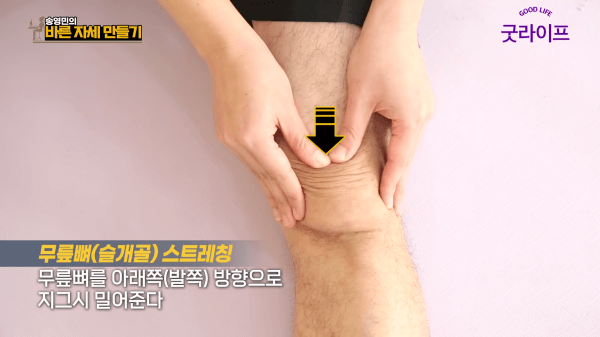 1. 한쪽 다리를 쭉 편 상태에서 허벅지에는 최대한 힘을 뺍니다. 엄지 손가락을 사용해서 무릎뼈를 아래쪽 즉, 발쪽 방향으로 지그시 밀어서 스트레칭 해주세요. 이 상태에서 10초 동안 유지합니다.