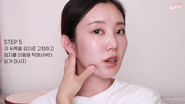 5. 귀 뒤쪽을 검지 손가락으로 고정합니다. 엄지 손가락을 이용해서 턱 아래에서부터 귀 밑쪽까지 당겨서 마사지를 실시합니다.