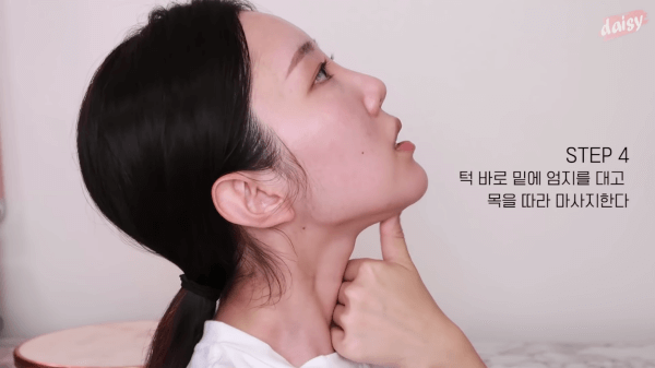 4. 고개를 뒤로 젖힌 상태에서 턱 바로 밑 부분에 엄지 손가락을 댑니다. 턱에서부터 목을 따라서 쓸어내리면서 마사지를 실시합니다. 8번씩 4번을 반복해서 실시합니다.