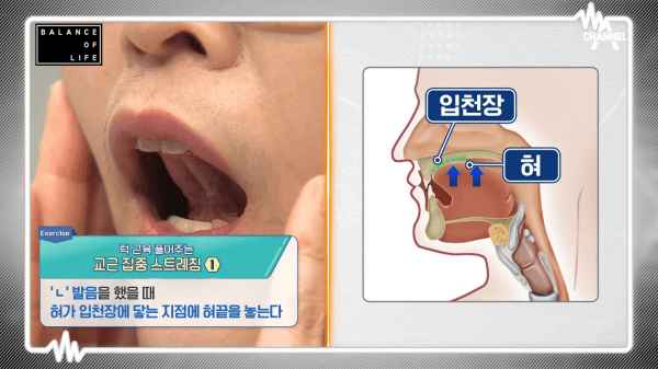 입천장에 혀끝을 붙이고 턱을 내린 상태에서 약 5초간 교근을 마사지하면 됩니다.