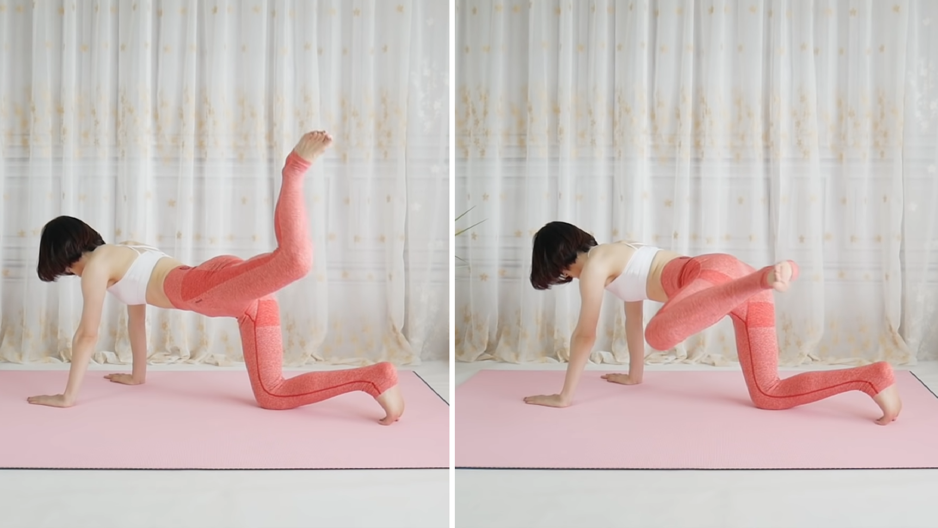 3. 길게 뻗은 오른쪽 다리를 공중에 띄운 상태에서 위, 아래로 움직이면 됩니다. 45초 운동하고 10초 쉽니다.