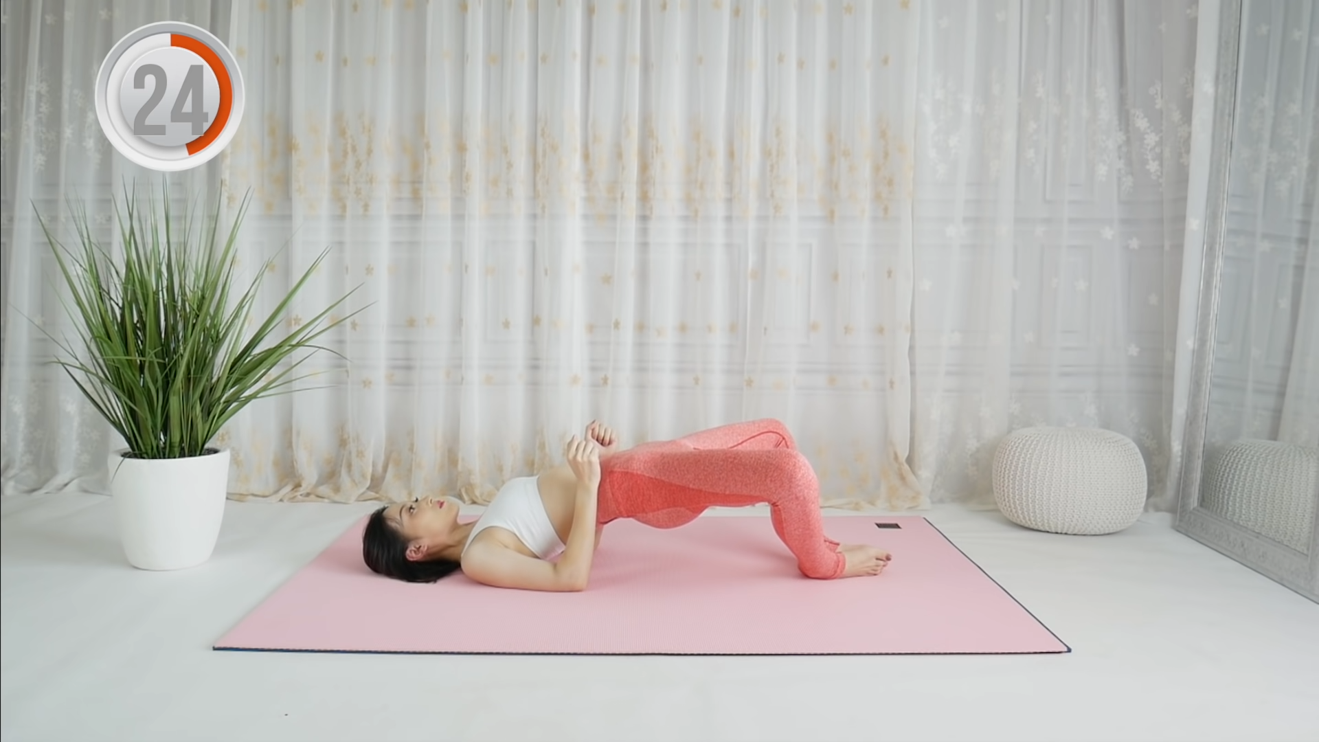 1. 바닥에 바르게 누운 상태에서 양쪽 발바닥을 마주보게 붙입니다. 머리와 등, 다리가 붙은 상태에서 엉덩이를 들어 올렸다가 내리는 동작을 반복하면 됩니다.