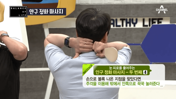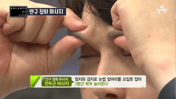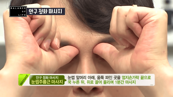 눈썹 앞머리 아래, 움푹 파인 곳을 엄지손가락 끝으로 꾹 누른 뒤, 위로 끌어 올리면서 1분간 마사지하면 됩니다.