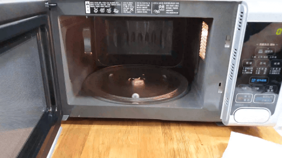 다음으로 전자레인지 문을 열어 보세요. 내부에 수증기 물방울이 맺혀 있는 것을 볼 수 있습니다. 하단에 있는 받침대를 빼낸 후에 키친 타올을 사용해서 내부를 청소해 주세요.