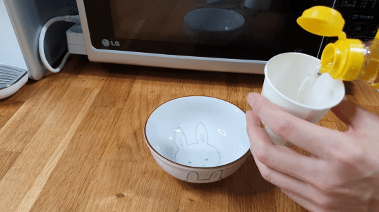 다음으로 식초와 물을 넣고 섞은 그릇을 전자레인지에 넣어 주세요. 4분 ~ 5분 정도 돌려 주세요.