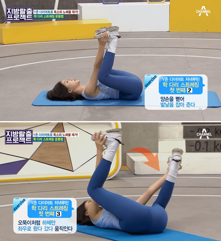마찬가지로 매트에 누운 상태에서 진행하도록 합니다. 양손으로 양쪽의 발을 잡아 주세요. 여기에서는 호흡에 집중해야 합니다. 숨을 들이 마실 때 무릎을 들어주세요. 숨을 내쉴 때는 10~15초 동안 가슴 옆쪽까지 최대한 허벅지를 당기도록 합니다. 왔다 갔다 하는 것을 1회로 하며 총 5회를 하도록 합니다.