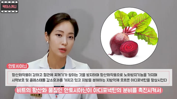 비트의 항산화 물질인 안토시아닌이 아디포넥틴의 분비를 촉진시켜서 지방의 분해를 촉진 시켜 줍니다.