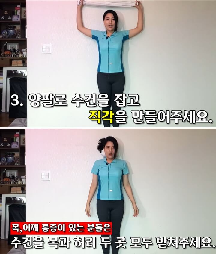 나머지 수건을 양손으로 잡고 팔의 모양을 직각으로 만들어 주세요. 이때 주의하셔야 할 점이 있습니다. 팔, 어깨 등에 부상이나 통증이 없는 사람만 이 동작을 하시기 바랍니다.