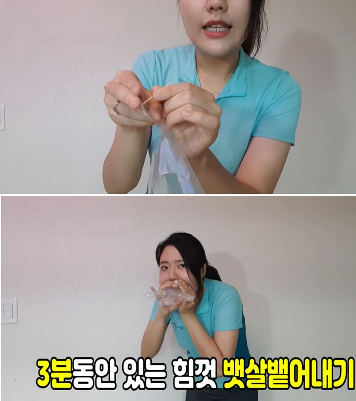 집에서 사용하는 일회용 비닐장갑을 사용하도록 합니다. 이쑤시개를 사용해서 비닐장갑의 손가락 끝 부분에 구멍을 뚫어주세요. 이제 주둥이 부분에 입을 대고 3분 동안 힘껏 호흡을 뱉어내면 됩니다. 마치 뱃살을 뱉어낸다는 생각으로 힘차게 해 주세요.