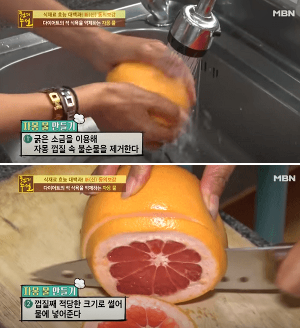 자몽 물 만드는 방법은 간단합니다. 굵은소금을 사용해서 자몽 껍질 속 불순물을 제거하도록 합니다. 이후에 흐르는 물에 껍질을 깨끗하게 닦아내면 됩니다. 다음으로 자몽을 껍질째 적당한 크기로 썰어서 물어 넣기만 하면 됩니다. 물에 충분히 우러나오면 식욕을 억제시켜주는 자몽 물 완성입니다.