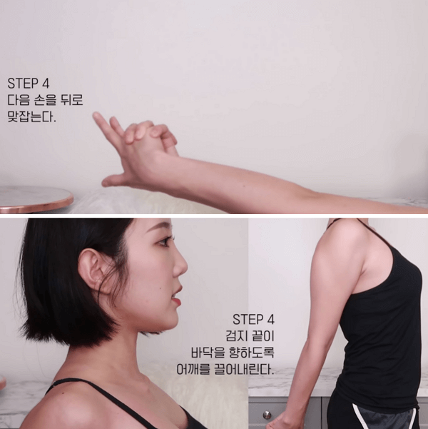 마무리로 스트레칭을 진행합니다. 두 손을 뒤로 맞잡습니다. 목은 꼿꼿하게 세운 상태에서 검지 손가락이 바닥을 향하도록 어깨를 끌어내립니다. 이 동작을 천천히 반복해서 해줍니다.