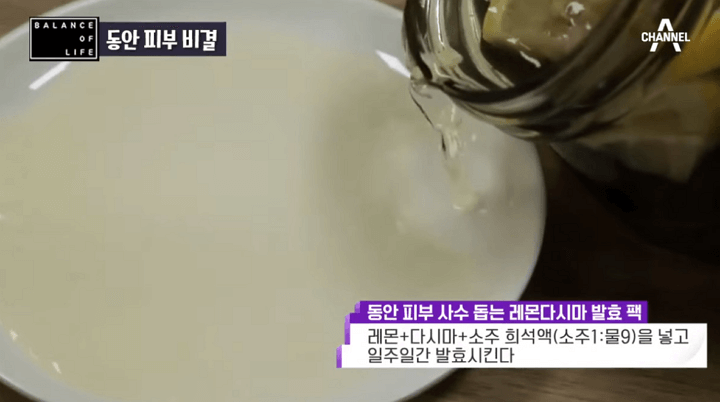 이날 한가지 피부관리 비결을 더 공개했습니다. 바로 레몬 다시마 팩입니다. 레몬과 다시마를 적당한 크기로 잘라 낸 후 소주 희석액에 넣고 일주일간 발효시켜서 만든다고 합니다. 이때 소주와 물의 비율은 1:9입니다.