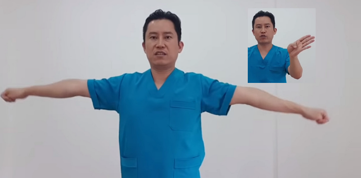 첫번째 동작입니다. 양손의 검지와 중지 손가락만 펴서 붙여주세요. 나머지 손가락은 모두 접으면 됩니다. 손바닥이 바닥을 보도록 앞으로 뻗으세요. 어깨 높이로 들면 됩니다. 다음으로 팔 전체로 큰 원을 그리면서 어깨를 뒤로 돌려주세요. 이번에는 반대로 앞으로 돌려주면 됩니다.