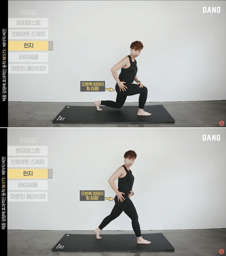 하체 운동의 끝판왕으로 불리는 런지입니다. 왼쪽 발을 뒤로 빼서 디뎌 주세요. 이때 뒤꿈치는 바닥에 닿지 않도록 들어주세요. 오른쪽 발은 앞으로 보내서 체중을 실어 주세요. 오른쪽 엉덩이에 힘을 주면서 앉았다가 일어나면 됩니다. 15회 반복한 후에 다리를 바꿔서 15회를 진행해 주세요.