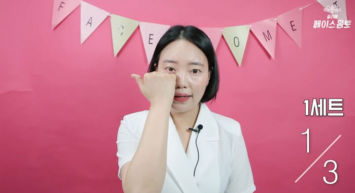 눈의 바로 밑 부분도 3 섹션으로 나누도록 합니다. 주먹을 쥐고 각근을 사용해서 눈 밑 부분에 대주고 좌우로 가볍게 흔들어주면서 풀어 주세요. 3 섹션으로 나눴던 부분을 각각 5초간 마사지하도록 합니다. 총 5세트로 실시하세요. 마찬가지로 왼쪽 눈 밑과 오른쪽 눈 밑 모두 해주면 됩니다.