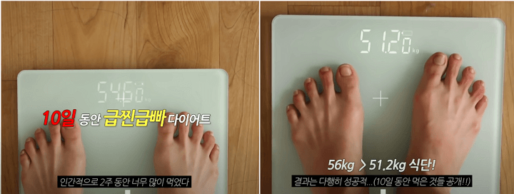 결과적으로 56kg의 몸무게에서 10일 만에 51.2kg이 되었습니다. 무려 5kg을 감량한 것입니다. 도대체 어떤 식단이었을까요?