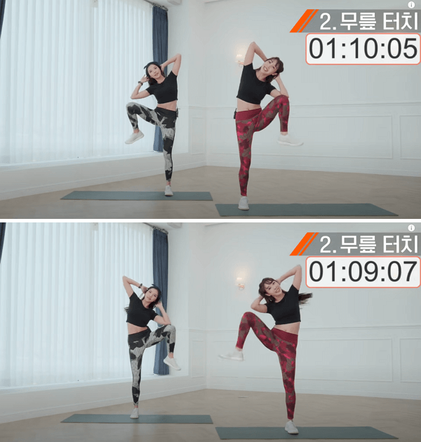 다음으로 왼쪽 팔꿈치와 왼쪽 다리가 만나도록 들어 올려 주세요. 반대쪽 팔과 다리도 똑같이 진행하도록 합니다. 30초 동안 운동을 실시하고 15초 휴식합니다.