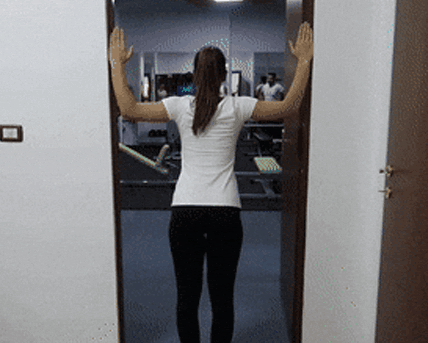거북목이 생기면 어깨와 가슴 부분이 경직되게 됩니다. 따라서 스트레칭으로 적절하게 풀어주는 것이 좋습니다. 양팔을 머리보다 높게 들어서 문틀에 대세요. 이제 가슴을 앞으로 내밀어서 가슴과 어깨 부분의 근육을 늘려서 스트레칭하면 됩니다.