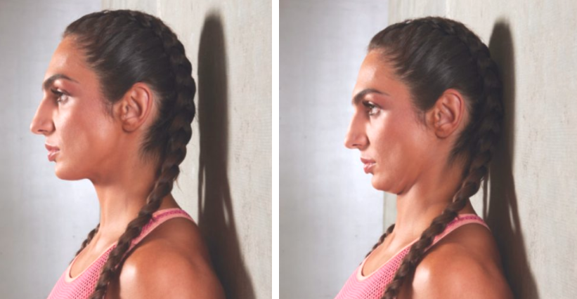 벽을 이용한 방법입니다. 벽에 등을 기대고 바르게 서세요. 뒤통수부터 등까지 정확히 벽에 닿도록 만드는 것이 핵심입니다. 이제 목 뒷부분이 뻐근한 느낌이 나타날 때까지 턱을 최대한 뒤로 당겨 주세요.