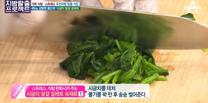 본격적으로 다이어트 식단을 만들어 보겠습니다. 시금치를 데친 후에 건져서 꽉 짜주세요. 수분을 제거하고 칼로 적당히 썰어 줍니다. 다음으로 후라이팬을 달구고 그 위에 올리브 오일 2그램을 넣어 주세요. 팬이 적당이 달궈지면 다진 마늘 2 티스푼과 준비한 시금치를 넣고 함께 볶아 주세요.